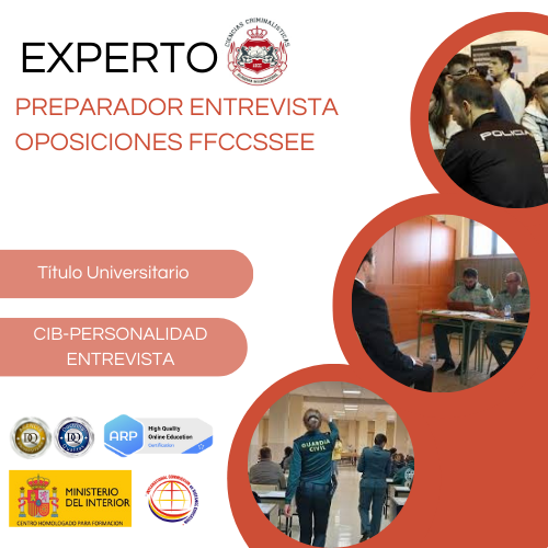 El Curso Universitario de Experto Preparador de Entrevistas para Oposiciones a Fuerzas y Cuerpos de Seguridad del Estado (FFCCSSEE) está diseñado para formar a profesionales capaces de evaluar, preparar y entrenar de manera eficaz a aspirantes en pruebas clave como el Cuestionario de Información Biográfica (CIB), test de personalidad y la entrevista personal.